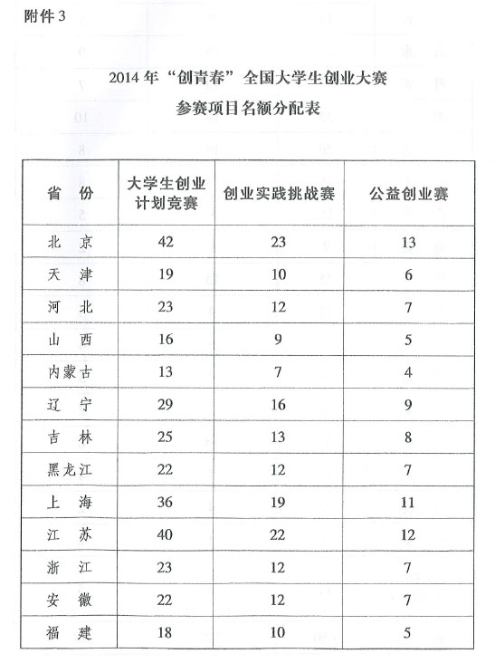 3.2014年“创青春”全国大学生创业大赛参赛项目名额分配表