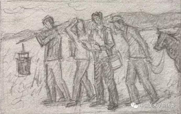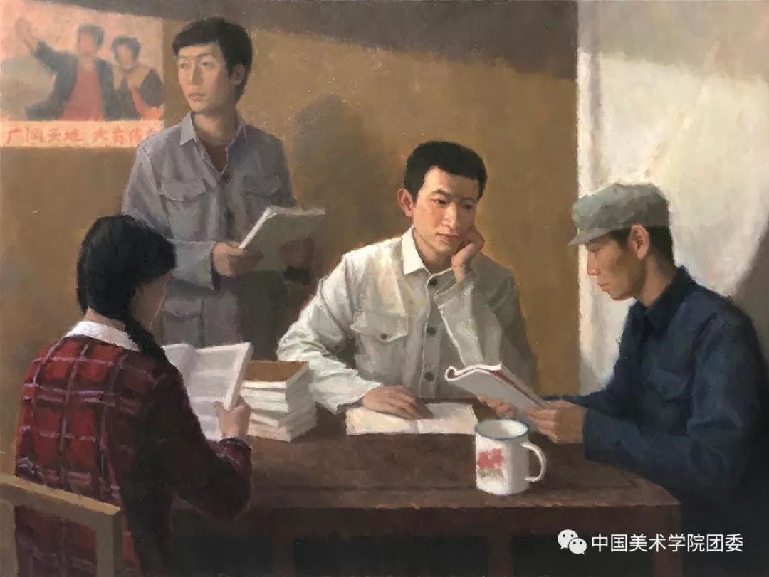 最初画面主题就确定为备战高考的下乡知青,他们在高中毕业后没有获得继续深造的机会,但仍保持着对知识的渴望。在当时特殊的背景下,复习时间紧迫,最初的设想是描绘知青们劳动结束后在返回途中抓紧时间复习,后来在老师的指导下把场景转向室内。前后多次修改草图,最后定稿构图以卡拉瓦乔《基督在以马忤斯的晚餐》为参考,把画面简化、聚焦。同时借助历史照片、影像资料、道具服装及模特来提供细节,最终转换为完整的作品。