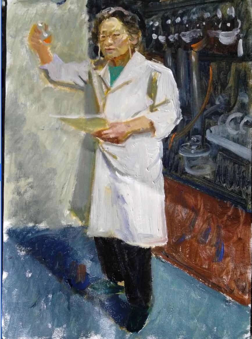作者说 “呦呦鹿鸣,食野之蒿”。青蒿素的科学史在今天最大的启示是——扎实做事,学好典籍,任重道远。我没有机会可以亲自去拜访屠呦呦教授,我细读她的传记,希望能够在脑海中有一个更立体、更真实的屠呦呦,并描绘出来。传记中,最打动我的是1971年10月初,屠呦呦带领课题组正在实验室紧张忙碌。这是190次的失败后,大家再一次严格按照流程进行筛选。10月4日,191号青蒿乙醚中性提取物样品抗疟实验对疟原虫的抑制率达到百分之百。此时的屠呦呦更是一心扎进实验室,争分夺秒以身求药。创作的这幅作品,素材选自屠呦呦1970年左右的照片,照片上的屠呦呦正看着手上的实验报告表,桌上架子上摆满了实验器材,但依然井然有序。在创作期间画了许多草,最终还是最接近照片的这个动作最满意,在何红舟老师和赵军老师的指导下最终定稿,并完成。