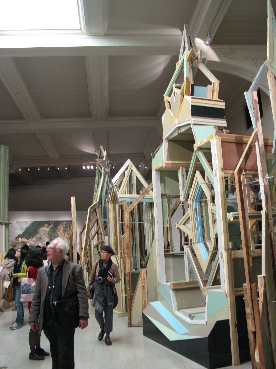 我觉得双年展的目的不仅仅应当做出一种能够吸引人们眼球的当代艺术品,而应该区别于传统艺术,形成批判性、实验性和探索性的特征,可能这其中绝大多数是不成熟的,是可能失败的,但像科学研究一样,失败也有其价值。就如我们所看到的,可能很多人都会觉得这次的双年展有一种看不懂与过度阐释的两难,很多机器零件的堆积,破旧木料的重组,动物标本的摆放等等。也许与上届双年展中架上作品占据较大比例相比,本届双年展中大量的装置、影像作品似乎更契合人们印象中的“当代”概念。本届双年展的主题为“巡回排演”,随着绵长的展厅慢慢的行进,我们也可以感受到作品的现场感、发声性和过程性十分明显。马良把杂乱的摄影工作室打包到美术馆进行展示,满屋子的稀奇古怪的小玩意儿吸引着参观者的眼球,仿佛把人们带入了另一个幻境;在邱志杰的作品中,几个人用大筒卫生纸“结绳记事”,戴着优伶面具的黑衣人在美术馆里结队穿梭;挪威小组的《世界剧院》采用了最新的视听设备和动态雕塑,表演的主题是“然后所有问号开始高歌”。在昏暗的带着淡淡灯光的屋子里,灯光、音乐、影子的交汇促成了人们视觉、听觉、感觉的交融……这些有趣的展厅都体现出了本届展览试图在形式上改变展览面貌,借用戏剧美学的现场感拓展空间和时间的延展性去阐释一种当代艺术美感。