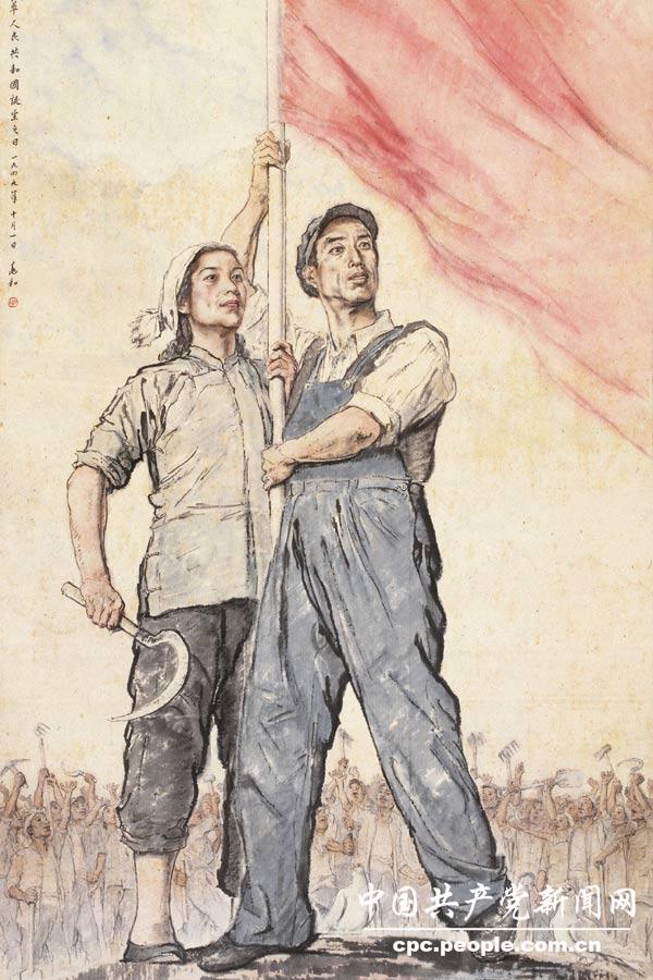 《中国人民站起来了》是著名画家蒋兆和为新中国诞生创作的庆生之作,创作于1949年。画面中人物着工农服装,高举红旗,目光坚毅,动作有力;背景欢呼的人物作虚化处理,突出了主体形象。画面中两位工农代表了千千万万受苦的中国人民,迎风飘扬的五星红旗代表了新中国的活力,画面主题明确,再现了新中国成立时中国人民扬眉吐气的喜悦与对新生活的向往。在创作手法上,画家采用的传统的用笔方法,使色墨和素描体面关系得到完美的结合,有力地拓宽了中国画的表现力。