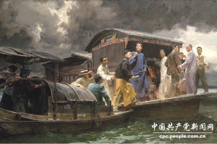 经过筹划准备,1921年7月23日晚,中国共产党第一次全国代表大会在上海法租界望志路106号(今兴业路76号)正式开幕。出席者有上海的李汉俊、李达,北京的张国焘、刘仁静,长沙的毛泽东、何叔衡,武汉的董必武、陈潭秋,济南的王尽美、邓恩铭,广州的陈公博,留日学生周佛海以及陈独秀委派的包惠僧。7月30日晚,会议刚开始几分钟,法租界巡捕房密探突然闯入,会议被迫中断。7月31日清晨,代表们分两批乘火车前往嘉兴,会议在缓缓划行的南湖画舫上继续召开。会议通过了《中国共产党的第一个纲领》,确定了党的名称、奋斗目标、基本政策,提出了发展党员、建立地方和中央机构等组织制度,兼有党纲和党章的内容。还通过了《中国共产党的第一个决议》,对今后党的工作作出安排部署。最后选举中央领导机构,建立三人组成的中央局,陈独秀任书记,张国焘为组织主任,李达为宣传主任。