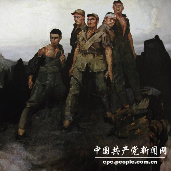詹建俊的《狼牙山五壮士》是一幅表现抗战的经典之作。画作抓取烈士跳崖之前横眉冷对日伪军的场面。五位壮士呈金字塔式构图,具有纪念碑般的效果,坚实而不可撼动,五个人动作神态各异,或回头怒视,或大义凛然,有的战士紧握双拳,表现出依然想消灭敌寇的愿望。作品中人物描绘惟妙惟肖,具有较强的体积感,整体色调偏冷,演奏出为中华民族献身的壮丽篇章。