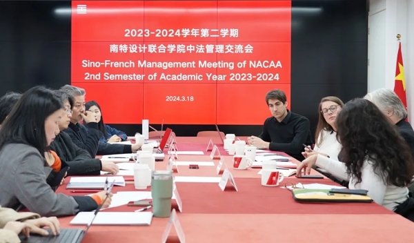 3月18日下午,中国美术学院南特设计联合学院 (简称“NACAA”) 2023-2024学年第二学期中法管理交流会在中国美术学院象山校区举行。法国南特大西洋设计学院校长克里斯蒂安·格勒林(Christian Guellerin)、中国美术学院副院长沈浩,国际教育学院、南特设计联合学院院长袁由敏、副院长汪建军等中法教学管理团队主要成员共同出席了此次会议。