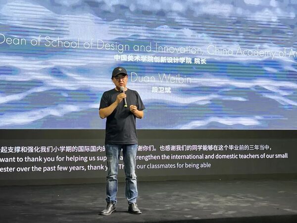 创新设计学院院长段卫斌在致辞中分享他对国际联合设计课程教学方式的思考,以及过去几年课程项目取得的成就。他回顾了PLAYSHOP的历史,并探讨了由PLAYSHOP引发的对教学方式更多可能性的思考。他用"高能现场"、"游乐场"和"玩吧"几个关键词传达他小学期学习不仅仅是传授知识,而是通过梳理优秀案例和创设开放性的学习环境,来延伸和拓展第一学期和第二学期的内容。最后,段院长对参与小学期中外导师表示感谢并希望他们能够更多地交流,并真正释放自我,展望未来。