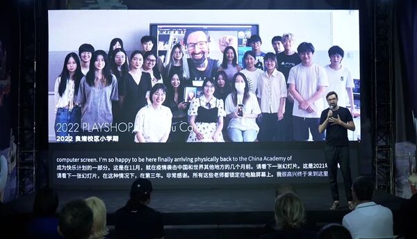 启动开幕后,来自海牙皇家艺术学院和荷兰埃因霍温设计学院的国际导师代表帕维尔·普库蒂奇(Pawel POKUTYCKI)发表讲话。他表示,作为参与前几届的小学期线上课程的国际导师,今年能亲身来到中国,来到中国美术学院创新设计学院参与2023 playshop,很兴奋,也对即将开始的教学和交流充满期待。