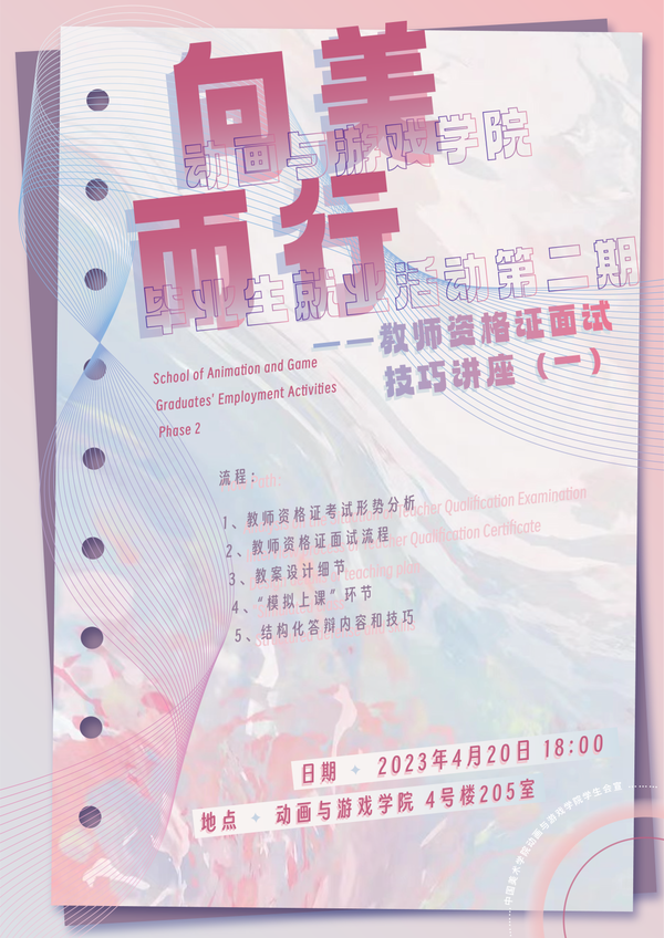 以毕业生就业需求为导向,为提升毕业生就业竞争力,帮助学生提高面试教师资格证通过率。动画与游戏学院邀请资深美术教师开设相关备考讲座,针对教师资格证面试环节,需要注意的事项及技巧进行专题指导与培训。让学生们对教师资格证考试有更加全面、深入的了解,帮助学生进行高效备考。