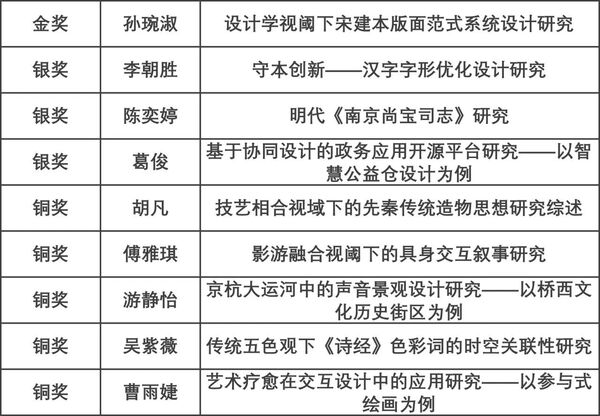 参赛的14位博硕研究生分别从各自的研究视角出发,展示了一定的学术水平和创新能力,主题涵盖汉字设计研究、古代文献研究、政务应用研究、设计思想研究、设计交互研究、景观设计研究等多个方向。此次比赛共决出金奖1名,银奖3名,铜奖5名。