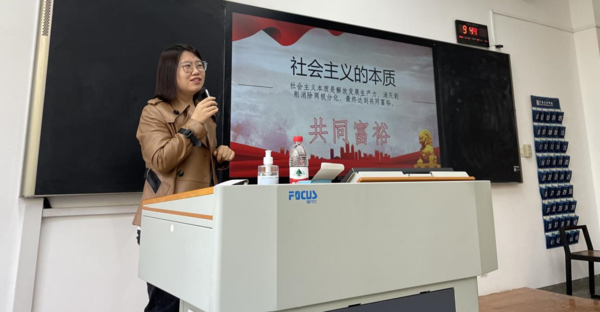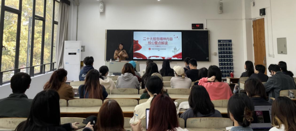主题党日活动在马克思主义学院青年教师杜姣所作的《党的二十大报告精神内容、核心要点解读》专题报告中开始。杜老师首先介绍了中国共产党第二十次全国代表大会的基本信息及大会主题;随后详细讲解了什么是中国特色社会主义,并结合浙江发展的案例,生动形象地讲述了社会主义的本质就是最终实现共同富裕;接着,从二十大的框架结构入手,简明扼要地一一展开,为师生党员生动解读二十大报告精神的核心要点,深入浅出的讲解让大家对二十大报告精神有了更深刻的认知与理解。