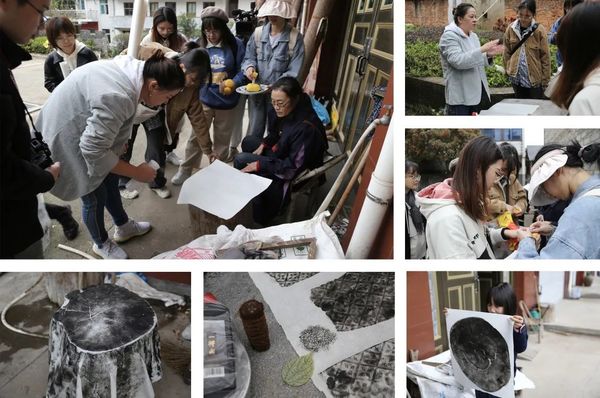 南山村,是唐诗之路和霞客古道的重要节点,位于天姥山南麓,被称为“养在深闺人未识”的千年古村,石板路印证着时光的流逝和诗人当年的足迹,屋檐、门楣上斑驳的木雕在漫长时光里磨出了古韵余香。李梅老师及文思老师就地取材,展开拓印示范教学,同学们在老师的指点下尝试拓包的制作,进行拓印技法的学习,将大自然的一草一木,一砖一瓦收入画中。在拓印树桩的过程中,邀请好奇观看的小朋友一起创作,感受树木年轮肌理的独特魅力,这正是美育的核心现场所在。