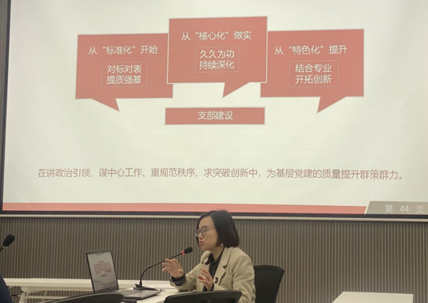 会议第一项议程由校党委组织统战部副部长盛晨霞进行支部书记专题培训,针对上一期学院党建工作的巡查和标准化建设存在的问题,提出了建议及整改要求。盛晨霞强调现在的高校基层党建工作,主要突出在“示范创建”和“质量创优”的这两方面,并对于支部书记应该履行的职责和在实际工作当中的一些内容进行了交流分享。