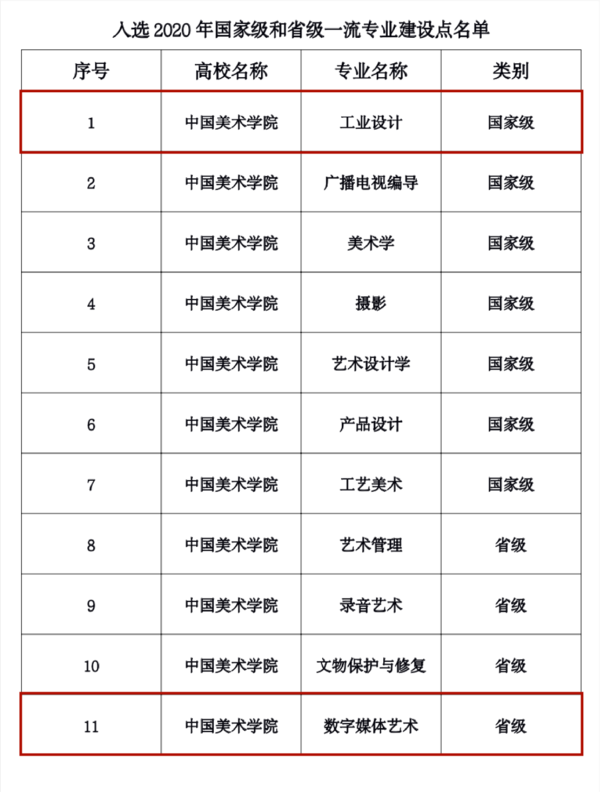 教育部办公厅公布了2020年度国家级和省级一流本科专业建设点名单,中国美术学院创新设计学院工业设计专业成功获批国家级一流本科专业建设点,数字媒体艺术专业成功获批省级一流本科专业建设点。