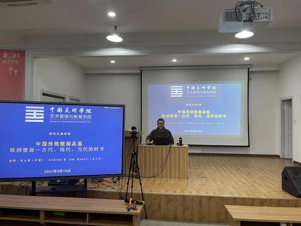 3月18日晚,我院何士扬教授联合意大利米兰布雷拉美术学院的Andrea B.Del Guerci教授分别进行了《中国传统壁画品鉴》《欧洲壁画—古代、现代、当代的时节》讲座,由校友、布雷拉美术学院研究生鹿晗同学担任翻译。何士杨老师展示了他自身实践过程中接触到的诸多传统壁画种类,Andrea B.Del Guerci教授详尽地介绍了西方壁画的发展历史与制作工艺,使非鉴藏系的同学也能够领略到中西方壁画的精妙与区别。