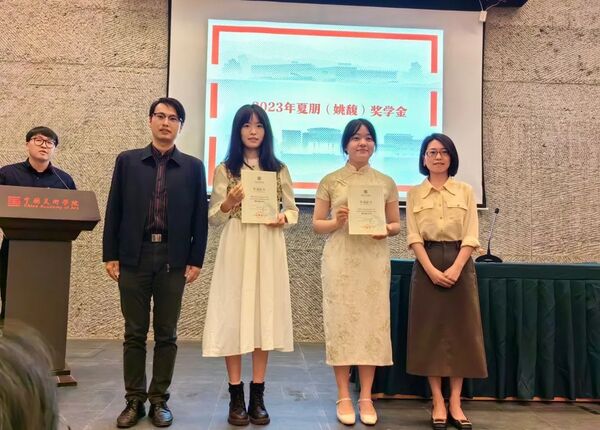 浙江省团校副校长卫甜甜、学工部副部长徐增鎏为2023年夏朋(姚馥)奖学金优秀学生、先进集体代表颁奖