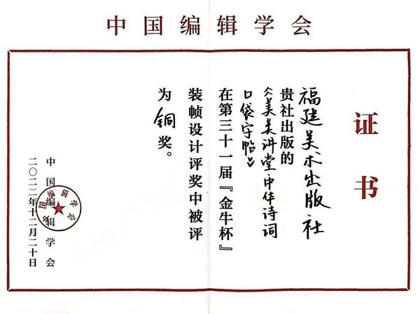 其中,由中国美术学院中国画与书法艺术学院、学工部联合出品的《美美讲堂·中华诗词 口袋字帖》获得“金牛杯”装帧设计铜奖。