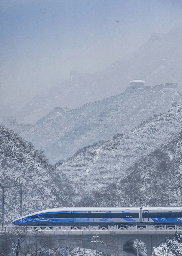 北京冬奥会期间,由西南交通大学工业设计团队参与设计的“瑞雪迎春”新型奥运版复兴号智能动车组在冰雪中飞驰。邢子鸣 摄(人民视觉)
