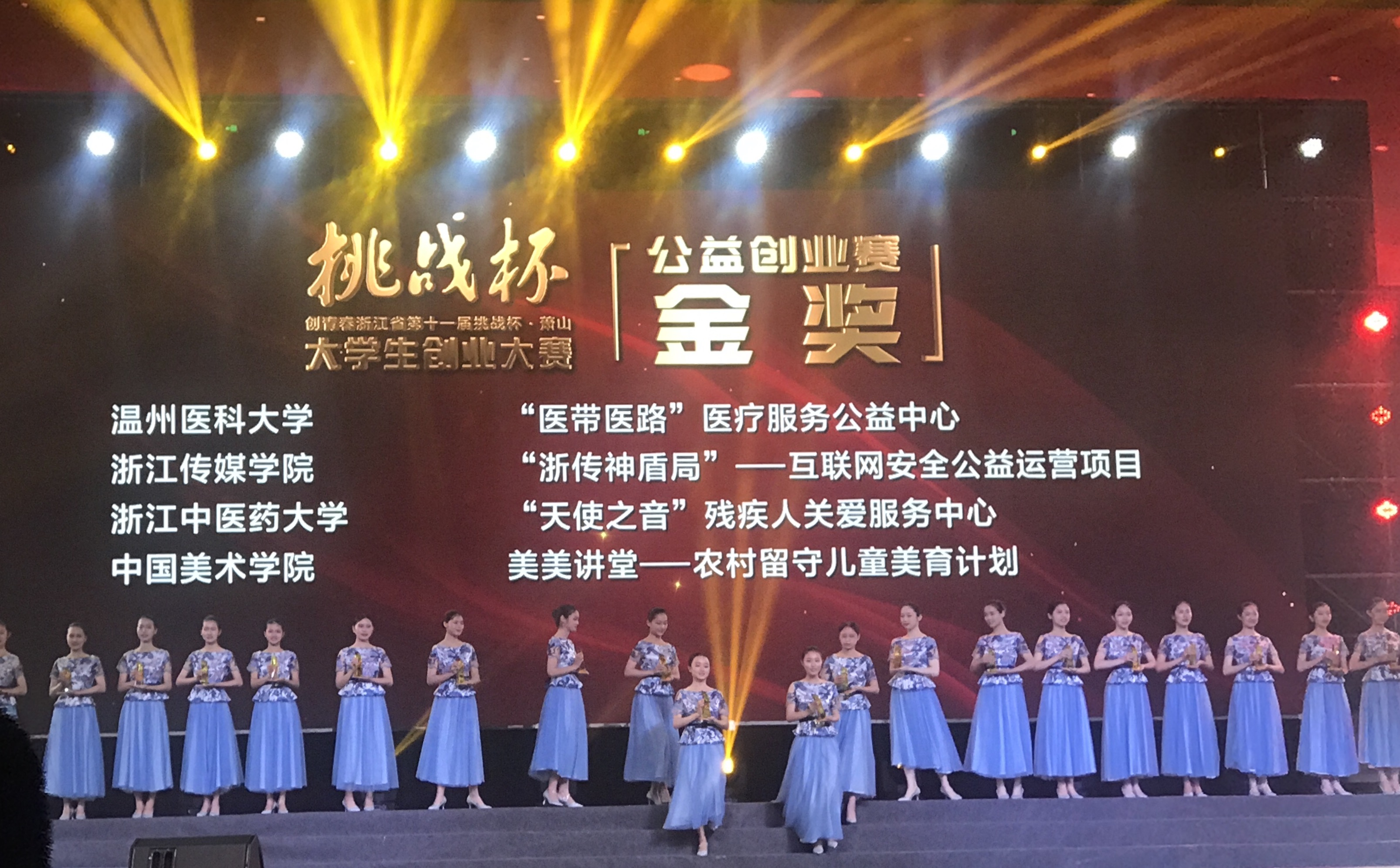 (“美美讲堂”项目成员张群(右九),在大赛闭幕式暨颁奖典礼上领奖)