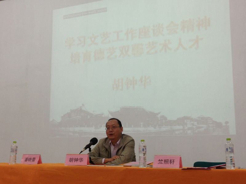 读书会上,院党委副书记胡钟华作了题为《学习文艺工作座谈会精神,培育德艺双馨艺术人才》的专题报告。胡书记结合延安文艺座谈会,向学生干部们重点传达解析了中央召开的文艺工作座谈会上习近平总书记的讲话精神和许江院长在座谈会上的发言,指出文艺工作座谈会是新时期的文艺指南。胡书记向与会团学干部提出四点希望:一是要认真学习总书记在文艺工作座谈会上的讲话精神,树立坚定正确的政治方向、文艺方向,在思想认识、道路认同上统一到文艺座谈会的精神上;二是要勤奋学习、刻苦钻研,打好坚实的基础、练好基本功;三是要向人民群众学习、向社会生活学习,在人民群众伟大实践当中吸取营养;四是要在继承传统的基础上,开拓创新,不断提高创新、创业和实践能力。
