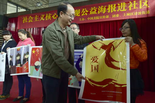 11月7日,中国美术学院“社会主义核心价值观公益海报创作活动”的优秀作品在上城区清波街道文化活动中心展出,并向该街道各社区赠送了300份印制的海报设计稿,用艺术作品来传播社会主流价值、引领文明风尚。